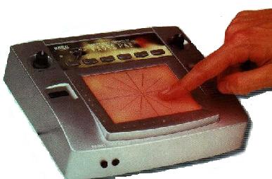 Push on FX= effect ON. Each FX has an X parameter and a Y one. Search in the FX control list for the appropriate name of the effect number you like. (e.g. N° 40 Reverb). Rub slowly and softly around in the X-Y area of the pad. In the display there appears a double number, for instance 3.2 or 7.8. 7(=X).8(Y). The effect number 9.9 is the maximum of the X - and Y- parameter. Rubbing and producing a voice sound through the microphone, you can switch between the program numbers, between FX= 1 and FX =50. Write down the numbers of programs that you prefer, and compare your preferences with other companions of your Kaoss team. Or, if you work alone, check out your changed preferences next week.