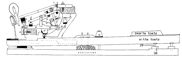De afbeelding toont een doorsnede van het mechaniek op het klavierraam. Het dempermechaniek dat zich in de vleugel bevindt is niet afgebeeld en wordt niet behandeld.