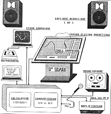 The UPIC is a configuration of a computer linked to a large-size digitizer table (75 by 60 cm) on which the user designs his music using an electromagnetic pencil. At the other end of the UPIC system, the digits are converted into sound through the loudspeakers. Two screens allow the permanent dialogue between man and machine.