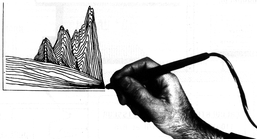 You can RECORD one or more external samples by converting them in your UPIC system. You can assign a global envelope to your page, make graphic or algorithmic transformations (rotations, symmetries, etc) . Once you have stored the set-up, the UPIC system includes also the modus of REAL TIME playback: when you move, accelerate, or stop your pencil , you can control the interpretation of the score manually. Just like a traditional instrumentalist or conductor.