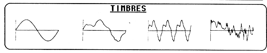 Take the pen, select DRAW on the function menu. Enter the bank of timbres. Draw your desired waveform and then the control screen will show the waveform: you store the waveform in the temporary memory of the computer. Then, select "HEAR" with your pen. Look for a pitch in the drawing area, you hear the sound immediately. Point on another square and after drawing the sound, you will hear a new timbre. About one hundred of timbres can be stored.