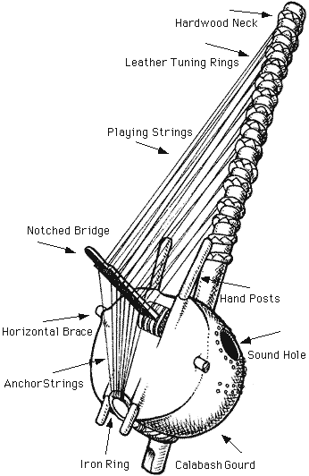 The kora's body is made from a calabash gourd cut in half and partially covered with cow skin. Traditionally, there are twenty-one playing strings plucked by the thumb and forefinger of each hand. The remaining fingers grip the two vertical hand posts. For strings, players use fishing line which provides a brillant tone and is easily obtained at the local market. Twenty-one anchor strings attach the playing strings to an iron ring bored through the base of the kora's hardwood neck. The player tunes the kora by moving the leather rings to achieve the appropriate tension on each string. Kora players use a variety of tunings. The tunings of the kora vary from region to region.The kora is a sweet-sounding, 21-stringed harp-lute, the hardest to play of all African instruments. Each kora has his own sound, and each plaeyer chooses his own range. the kora is tuned by moving the hide rings on the instrument's neck up and down, which changes the tension an pitch of the strings.