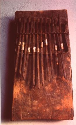 The "thumb piano" consists of a number of split cane metal tongues (10 or more) over a wooden resonator, the tongues are supported by a lateral bar. Often, the thumb-piano is made from old spoon handles, bicycle spokes or spring wire that is cut and hammered to the desired shape.
