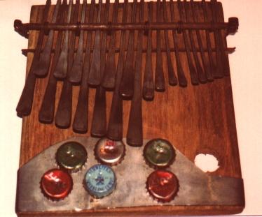 However, the sound of the kalimba is now found on most digital samplers. It isn't unusual at all that two ikembes play together: one covers the melodic accompaniment of the vocalist, while the other plays the bassline (or bourdon). The picture above represents a really modern sanza (made in Cameroun, Central Africa) with an integrated bassline (larger lamellas at the left side), and also a rhythm part: crown caps fixed on a vibrating sheet of metal!
