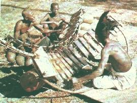 The xylophone from the gamelan ensemble is called 'gambang' while the African xylophone has a tribe-typical name in Oeganda (akadinda), in Ethiopia (ambira), in Mali (bala), in Sudan (balafo), in Congo (dimba) and in the Bantu tribes of soutern Africa (mbila).