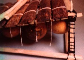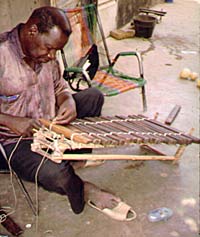 < The famous Keletigui Diabaté (Mali) attaches the calabashe resonators (=amplifiers) on a new balaphone.