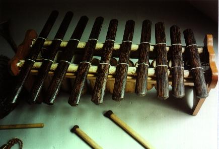 My balaphon from Burkina Fasso (= earlier Upper-Volta, on top of Benin etc.) The balaphone is the oldest Griot instruments. The bala are hit with mallets that are made from hard wood.
