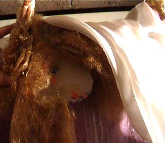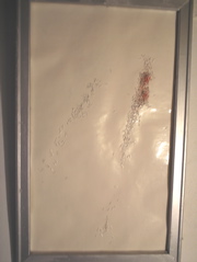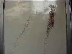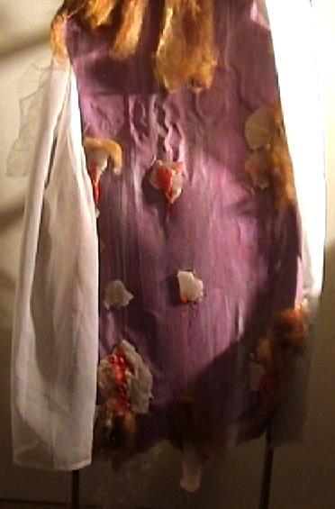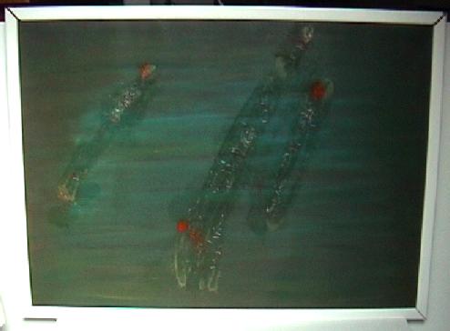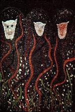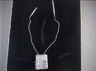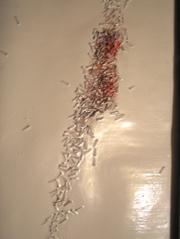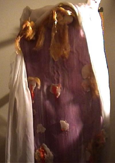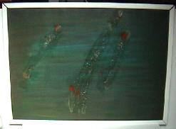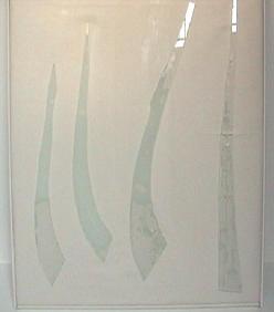The white skin of the daily life is defaced (=> covered nails).DETAIL GREEN SNOW © P-ART Dangerous rain of nails - green snow - disturbes our world. Oil paint on canvas. Nails. BLACK MADONNA ©P-ART LILIES OF TROY P-ART © 2002 Glass fragmentations on vanilla background: White painted canvas in white frame.