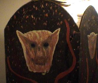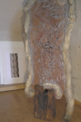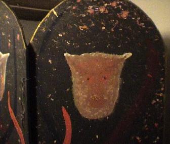 MR. FEELING P-ART © 2004 Assemblage of a used electric item with white painted moving feelers and fragile (glass) foots fixed on canvas. MASK P-ART © 2005 divine mask in elaborated stone © 2005