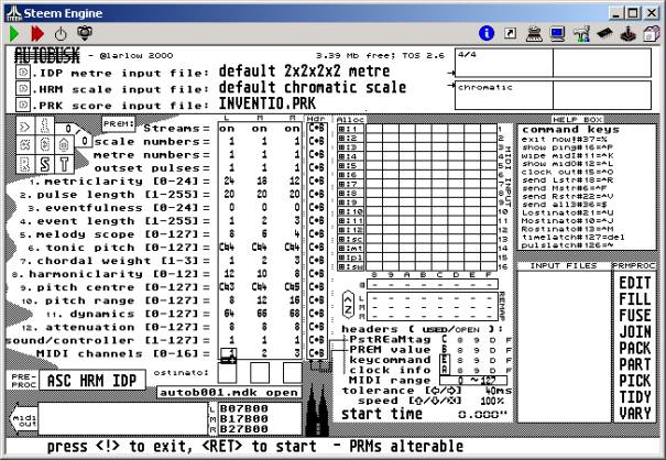 The most interesting parameters include rhythmicity (how a rhythmic stream will vary with respect to an original); "tonicality" (how close to a tonality it will remain); eventfulness (how often a note will occur). There are also range; distance from a central pitch; the interval limit the melody may leap; tempo; note duration and embouchure; chromaticism; voice assignments and usual Midi parameters; and a number of specialized controls. (cf.: http://www.maltedmedia.com/books/papers/s7-headb.html chapter Parameters of music, by Dennis Báthory-Kitsz)Autobusk is a real-time pitch and rhythm generator. Click on the diagram and you can see the main Autobusk desktop in full display: