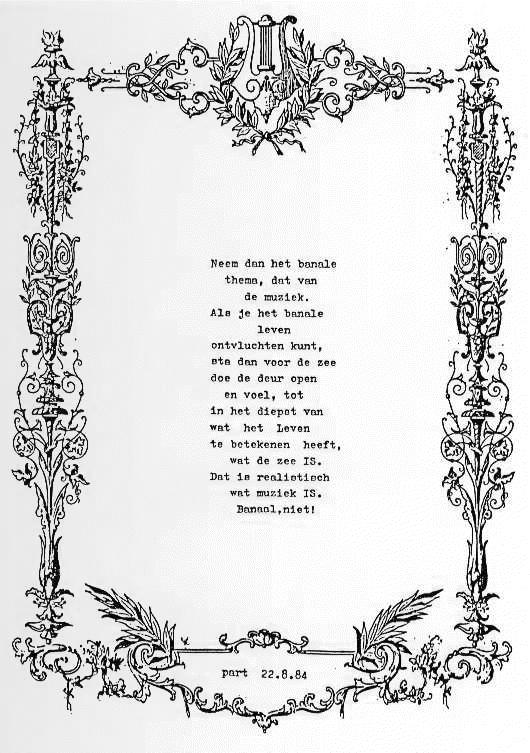 P-ART HOMEPAGE: [P-ARTPARADISE] [P-ARTWEB of ARTISTS] [P-ART DVD White as Piano][P-ARTPROJECT:CD] [ P-ARTHOTLINKS ] [ P-ART "TOUCH-AND-GO"] [P-ARTHOT PAGE ] [ABC-INDEX of all P-ARTTOPICS] [SITE MAP] [GUESTBOOK] [FOR P-ART SMARTists] [BACK TO MAIN PAGE] [GUEST BOOK] [Gallery of P-ART MUSIC CLIPS] Wat een kunstenaar te doen staat o In den Hof der Academie o De Maagd der Wanhoop o Quereterpe Mabete o De ultieme Zwakte o ALS IK - gedichten o Soldaten marcheren o Litanieën o De lift o Het geluid van de Waarheid o De mug o Banaal o back to P-ART POETRY-index THE POETRY OF P-ART Go to P-ART AUDIOVISUAL DOMAIN