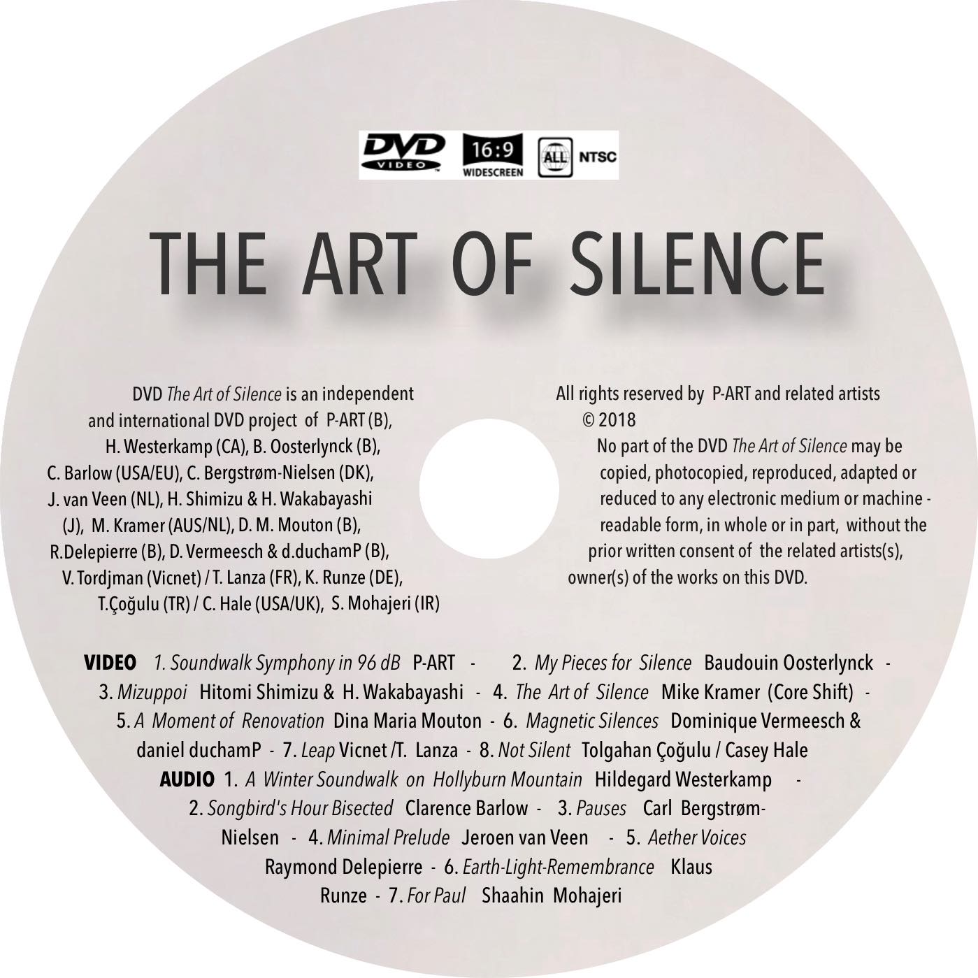 P-ART: Video Track #1: Soundwalk Symphony in 96 dB (2017) 5:36 booklet p. 5 Baudouin Oosterlynck: Video Track #2: My Pieces for Silence (2017) 5:08 booklet p. 9 Hitomi Shimizu & H. Wakabayashi: Video Track #3: Mizuppoi (Waterish) (2017) 5:13 booklet p. 18 Mike Kramer/ Core Shift: Video Track #4: The Art of Silence (2017) 6:54 booklet p. 21 Diana Maria Mouton: Video Track #5: A Moment of Renovation Dance (2017) 6:30 booklet p. 23 Dominique Vermeesch & daniel du chamP: Video Track #6: Magnetic Silences (2017) 5:03 booklet p. 27 Vincent Tordjman (Vicnet): Video Track #7: Leap (2017) Film by Thomas Lanza 4:26 booklet p. 29 Tolgahan Çoğulu: Video Track #8: Not Silent (2017) Composition by Casey Hale 4:19 booklet p. 33 |