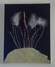 Canvas on canvas / 4 feathers (dynamic element: blowing the painting) with goldpainted feather, dry natural and nearly invisible stalks (glass).
