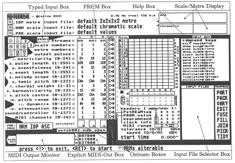 The most interesting parameters include rhythmicity (how a rhythmic stream will vary with respect to an original); "tonicality" (how close to a tonality it will remain); eventfulness (how often a note will occur). There are also range; distance from a central pitch; the interval limit the melody may leap; tempo; note duration and embouchure; chromaticism; voice assignments and usual Midi parameters; and a number of specialized controls. (cf.: http://www.maltedmedia.com/books/papers/s7-headb.html chapter Parameters of music, by Dennis Báthory-Kitsz)Autobusk is a real-time pitch and rhythm generator. Click on the diagram and you can see the main Autobusk desktop in full display: