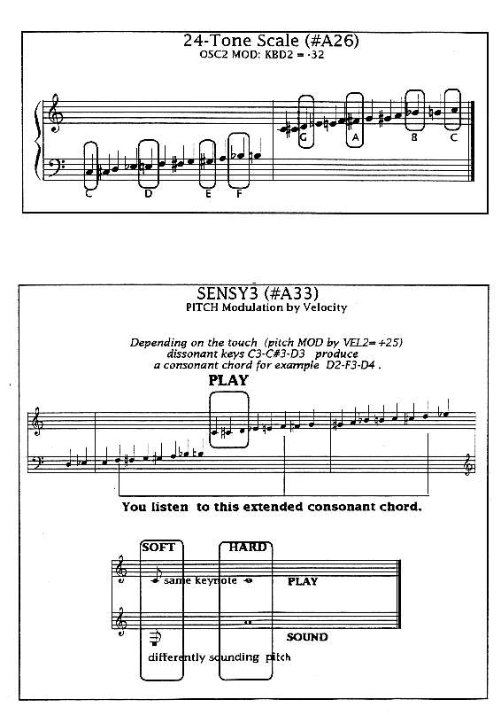 To build today for instance a real 19-tone keyboard,you need more gray and black tones between the white keys. In my self made P ART Soundset for a digital WAVE synthesizer I have integrated a whole range of ground breaking microtonal and macrotonal scales integrated in the sound patches of my ESQ1- synthesizer (Ensoniq).